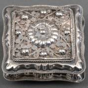 1e gehalte zilveren lodereindoosje met reliëfdecor, meesterteken: vogel, Amsterdam, 1768, gewicht 18,2 gram, 3 × 3 cm