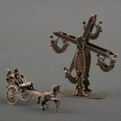 Twee 2e gehalte zilveren miniaturen: reuzenrad, en rijtuig met paard, gewicht 98 gram, reuzenrad 8 × 9,5 cm -wiel rijtuig los-