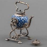 2e gehalte zilveren miniatuur: bouilloire met Chinees porseleinen buik, 19e eeuw, brutogewicht 39 gram