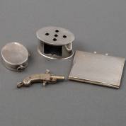 Drie 2e gehalte zilveren miniaturen: stoof, foto-etui, en ovaal pillendoosje met hangoog, gewicht 42 gram, daarbij: een onedel miniatuur revolver, fotolijstje 4,8 × 3,6 cm