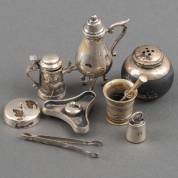 Diverse zilveren miniaturen, veelal 2e gehalte, waaronder: kraantjeskan en vijzel, gewicht 68 gram
