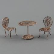 2e gehalte zilveren filigrain miniaturen: tafel en twee stoelen, gewicht 15 gram, hoogte tafel 3 cm