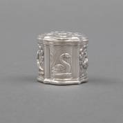 1e gehalte zilveren lodereindoosje met reliëfdecor, onduidelijk meesterteken, mogelijk Carolus van Ham, Amsterdam, 1760, gewicht 19,4 gram, 3 × 3 cm