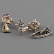 Vier 2e gehalte zilveren miniaturen: platbodem, zeilbootje, draagkoets en rijtuig, gewicht 43 gram
