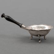 Zilveren miniatuur: pijpkomfoor op drie pootjes, met houten steel, meester: Johannes van Somerwil, Amsterdam, 1737-1764, lengte inclusief steel 7,5 cm, brutogewicht 11,8 gram