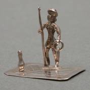 Zilveren miniatuur: visser, 18e eeuw, ongekeurd -visser op ander basement geplaatst-, gewicht 12,0 gram, 3,7 × 3,8 × 2,6 cm