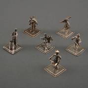 Zes 2e gehalte zilveren miniaturen: schoorsteenveger, karner, timmerman, twee muzikanten, en een valkenier, gewicht 48 gram