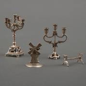 Vier 2e gehalte zilveren miniaturen: vijfarmige kandelaar, drie-armige kandelaar, onderstel van wiegje en molentje, gewicht 38 gram, grootste kandelaar 6 × 2,8 × 2,5 cm