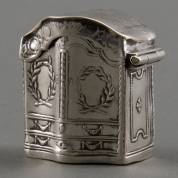 2e gehalte zilveren kabinetvormig lodereindoosje met op achterzijde tekst: 'Dit kabinet heb ik van doen, het is al weer een nieuw fatzoen', meester: Jacob Kooiman, Schoonhoven, 1886, gewicht 18,6 gram, 3,9 cm