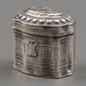 2e gehalte zilveren lodereindoosje, mandvormig model met gedreven motieven, meester: Carolus Hendricus Cammans, Leeuwarden/Groningen, 19e eeuw, gewicht 21 gram, hoogte 4 cm