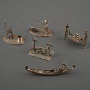Vijf 1e en 2e gehalte zilveren miniaturen: visser, gondelier, man met zwijn, en twee fruitdragers, gewicht 86 gram