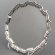 Rond geaccoleerd 1e gehalte zilveren cabaret op drie pootjes, uitgebreide inscriptie op onderzijde, meester: Garrard & Co, Londen, 20e eeuw, gewicht 334 gram, Ø 22 × 2,5 cm