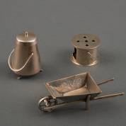 Drie 2e gehalte zilveren miniaturen: kruiwagen, doofpot, en stoof, gewicht 70 gram, doofpot, Ø 3,2 × 5 cm