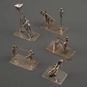 Vijf 2e gehalte zilveren miniaturen: twee lantaarnontstekers, man bij aambeeld, schermers, en schaatser, gewicht 69 gram