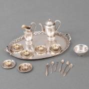 3e gehalte zilveren miniaturen: compleet zestiendelig theeservies, bestaande uit: dienblad, zes kop en schotels, zes lepels, karaf, spoelkom en koffiekan, blad gemerkt: P.J.H. en 13, Duitsland, circa 1800, gewicht 89 gram, 4 × 10,5 × 7,2 cm
