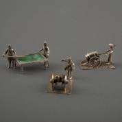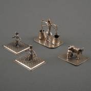 Vier 2e gehalte zilveren miniaturen: koeienmelker, jukdrager, dame met springtouw, en dame, alle op onderplateau -dame defect-, gewicht 53 gram