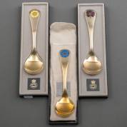 Drie 1e gehalte verguld zilveren jaarlepels met geëmailleerde bloemen in de steel, 1972, '73 en '74, ontwerp Annelise Bjørner, uitvoering Georg Jensen, Denemarken, gewicht 134 gram, lengte 15 cm -gebruikssporen, twee lepels met originele doos, de ander met stofdoek-