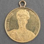14kt gouden munthanger; Marie Louise van Hessen Cassel, 'Mij ontbreekt niets dan dankbaarheid', gewicht 4,0 gram, Ø 2 cm