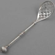 2e gehalte zilveren eierlepel met opengewerkte bak en getorste steel, eindigend in bol, Nederland, 1896, lengte 22,5 cm, gewicht 64 gram