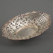 Ovaal 2e gehalte zilveren bonbonmandje, de opengewerkte rand met bloemdecor, gewicht 89 gram, 3 × 18 × 11 cm