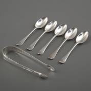 Vijf zilveren toespijslepels, Hollands glad, 18e/19e eeuw, zilveren klontjestang, Amsterdam, 1803, gewicht 147 gram, lepel 13,5 cm, tang 14,5 cm