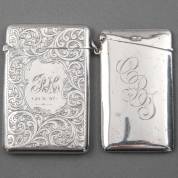 1e gehalte zilveren koker met gegraveerde voluten, de voorzijde met monogram 'RH' en datum '29-08-07', Londen, 1902, en een 1e gehalte zilveren visitekaarthouder met gegraveerd monogram 'CBJ', Londen, 1908, gewicht 100 gram, 8,5 × 5,6 cm