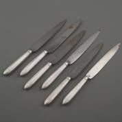 Zes dinermessen met 2e gehalte zilveren geribde heften, meester: A. Bonebakker & Zoon, Amsterdam, 1884-1891, de stalen lemmeten gemerkt Goutelerie Royale, T.F. Bastet, Amsterdam, brutogewicht 645 gram, 26 cm -roestvlekjes-