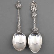 Twee diverse zilveren gelegenheidslepels, circa 1800, langste 18,5 cm, gezamenlijk gewicht 81 gram -beide met restauraties aan de heften-