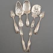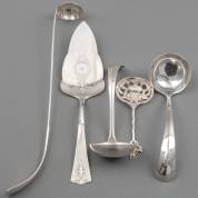 Diverse 2e gehalte zilveren dienbestek: twee sauslepels, morellenlepel, taartschep, en strooilepel, diverse jaren en meesters, gewicht 258 gram, 30 cm