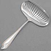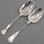 Twee 2e gehalte zilveren strooilepels met getorste steel, de greep met parelrand, 1888 en 1903, gewicht 149 gram, 25 cm