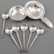 Zes 2e gehalte theelepels en BWZG theezeef, gezamenlijk gewicht 142 gram, lengte theezeef 13,2 cm