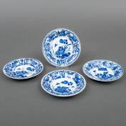 Vier Chinees porseleinen schoteltjes met blauw-wit decor van bloemen en insecten op rotsen, Kangxi, gemerkt met zegel -kleine defecten, één gelijmd-, Ø 12,8 cm