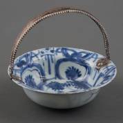 Chinees porseleinen klapmutskommetje met blauw-wit decor: vogels en bloemen, Wanli, voorzien van 2e gehalte zilveren hengsel, jaarletter 1896 -kleine defecten-, Ø 14,5 x 5 cm