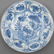 Chinees kraakporseleinen schoteltje met blauw-wit decor: krekel op rots, de rand met vruchten en kostbaarheden in cartouches, Wanli -gelijmd-, Ø 14 cm