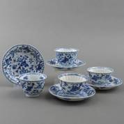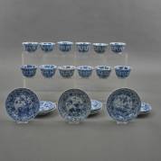 Zes Chinees porseleinen cafe-au-lait kommetjes en schoteltjes met blauw-wit jachtdecor, 19e eeuw -één schoteltje met randchipje-, schoteltje Ø 13,5 cm
