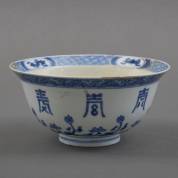 Chinees porseleinen klapmutskom met blauw-wit decor: acht karakters en bloemenrand, Chenghua gemerkt, Kangxi -restauraties-, Ø 16,5 cm