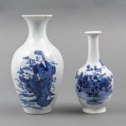 Twee Chinees porseleinen steelvaasjes met blauw-witte decors, 19e eeuw -de kleinere vaas met twee chipjes van de binnenzijde voetrand-, hoogste 20,5 cm