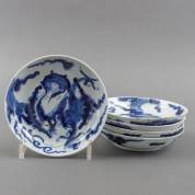 Vijf Chinees porseleinen bordjes met blauw-wit decor: pareljagende draak, Yongzheng, gemerkt -randschilfertjes-, Ø 15,5 cm