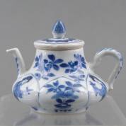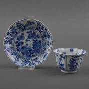 Chinees porseleinen kom en schotel met gecontourneerde rand en blauw-wit decor: bloemen en insecten, jade gemerkt, Kangxi -randschilfertjes-, 5,5 x Ø 13 cm