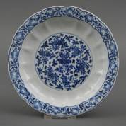 Chinees porseleinen lotusvormig bord met blauw-wit floraal decor, gemerkt, Kangxi -chipjes van standring, enkele schilfers van rand-, Ø 21 cm