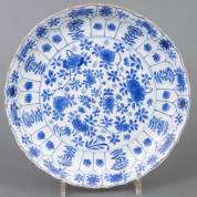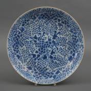 Chinees porseleinen schotel met vol blauw-wit floraal decor, 18e eeuw -missend stukje glazuur in het plat, chip en haarlijn aan de rand-, Ø 38 cm