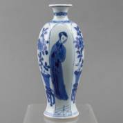 Chinees porseleinen vaasje met blauw-wit decor van lange lijzen, Kangxi -minieme schilfer van de bovenrand-, 15,5 cm