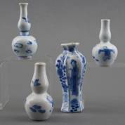 Vier Chinees porseleinen miniatuurvaasjes met blauw-wit decor, waaronder één paar met zotjes, 17e/18e eeuw -enkele kleine schilfers-, hoogste 9 cm