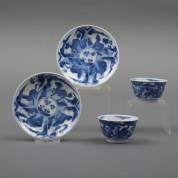 Paar Chinees porseleinen kommetjes en schoteltjes met blauw-wit decor van mythologische dieren, gemerkt, Kangxi -één kommetje en schoteltje met defecten-, 4,5 × 11,2 cm