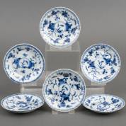 Zes Chinees porseleinen schoteltjes met blauw-wit decor van ganzen op rots omgeven door bloemen, Kangxi -randschilfertjes en haarlijn-, Ø 11,7 cm