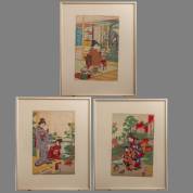 Mogelijk Toyohara Chikanobu (1838-1912), landschap met chrysanten en vrouwen, Japanse houtblokdruk, triptiek, eind 19e eeuw, alle separaat ingelijst, elk 35 × 24 cm