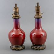 Paar Chinees porseleinen flambé vazen, vermaakt tot olielampen, 19e eeuw -zonder lampenglas-, 48 × Ø 19 cm