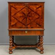 Wortelnoten kruisvoetkabinetje, de bovenkast met twee deuren waarin ieder een halve ster ingelegd, het onderstel met gedraaide poten verbonden door regel -lichte scheurvorming in het fineer van de deuren, slijtage aan de bovenrand-, 152 × 108 × 54 cm