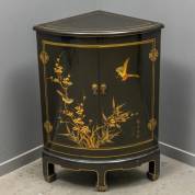 Zwart lakwerk hoekkastje met twee deurtjes, waarop vogel- en bamboedecor, China, modern, 85 × 45 × 45 cm