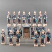 21 polychroom beschilderde Chinese terracotta grafbeeldjes: negentien manfiguren, één vrouwfiguur, en één pagode, Ming, hoogte pagode 22,5 cm